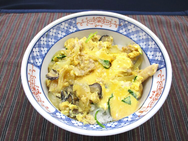 親子丼、豆腐とわかめのみそ汁、小松菜とえびのソテー、さつま芋のサラダ、しば漬、和梨ゼリー