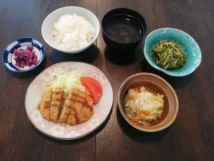 ごはん、岩海苔のみそ汁、とんかつ、白菜の炒め煮、胡瓜とめかぶの和え物、しば漬け