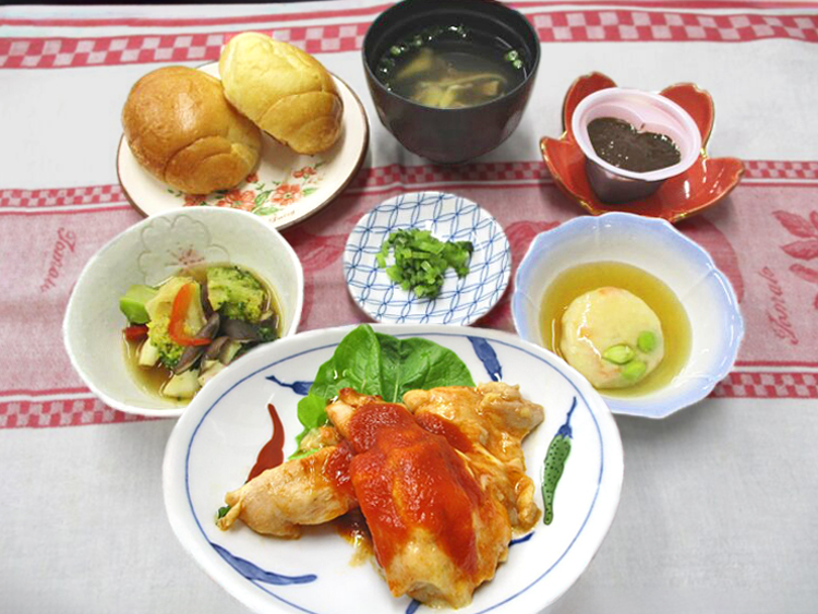 バターロール、舞茸のスープ、鶏肉のチーズ焼き、ブロッコリーといかのソテー、