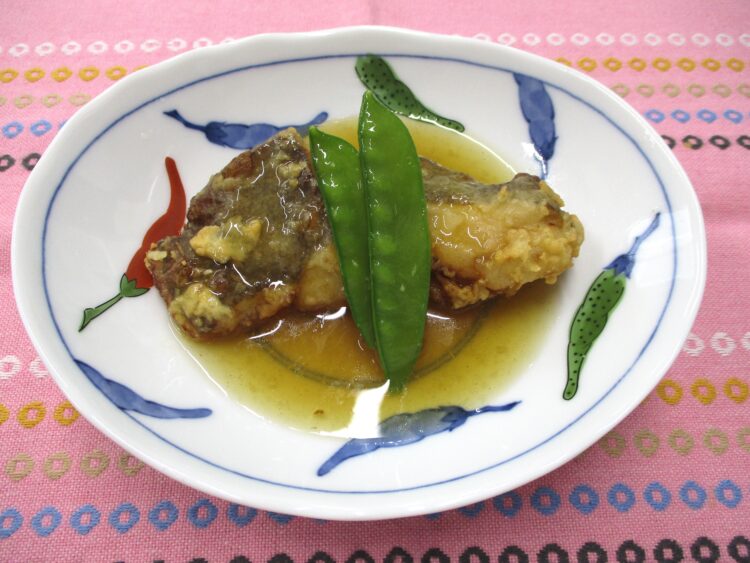 ご飯、豆腐となめこのみそ汁、かれいの揚げ煮、カリフラワーとベーコンのソテー、