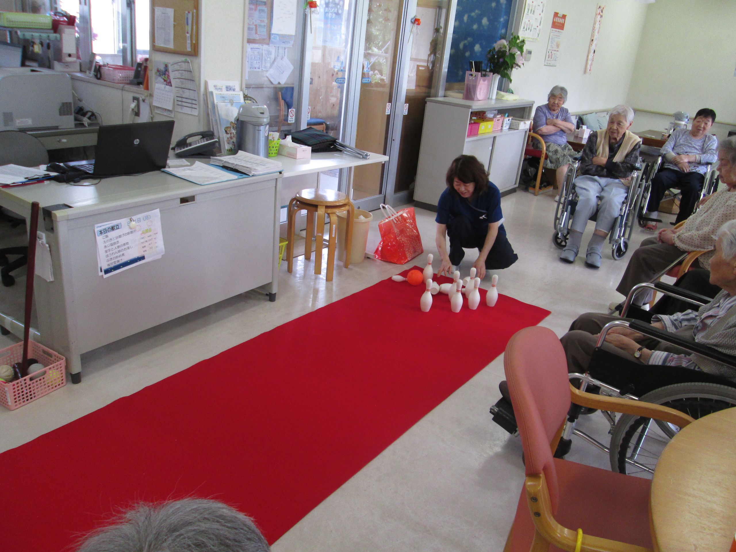 パターグルフの先では・・・職員が飛んで来るボールを受け止め、ピンを並べる職員が必要です。影で動いてくれる職員がいるおかげで、余興を楽しくすすめております。