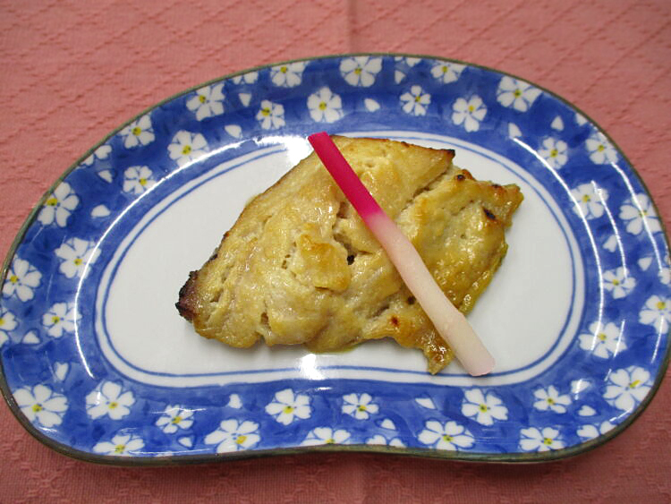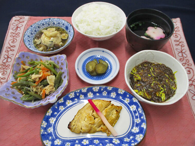 ご飯、花麩と万能ねぎの清汁、ほっけの西京焼き、いんげんと豚肉の炒め物、おさかなとひじきの豆腐よせ、菊ともずくの酢の物、相馬きゅうり漬