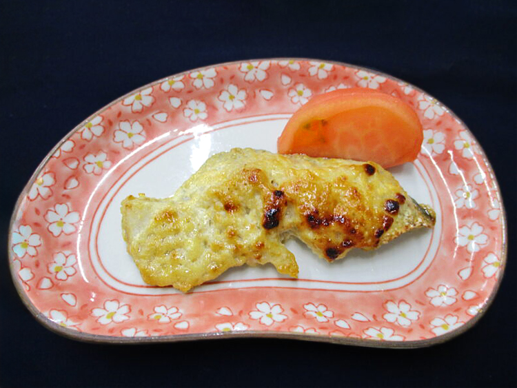 ご飯、わかめスープ、たらの味噌マヨネーズ焼き、生揚げと舞茸のソテー、レンコンはさみ揚げ、ほうれん草のごま和え、相馬きゅうり漬