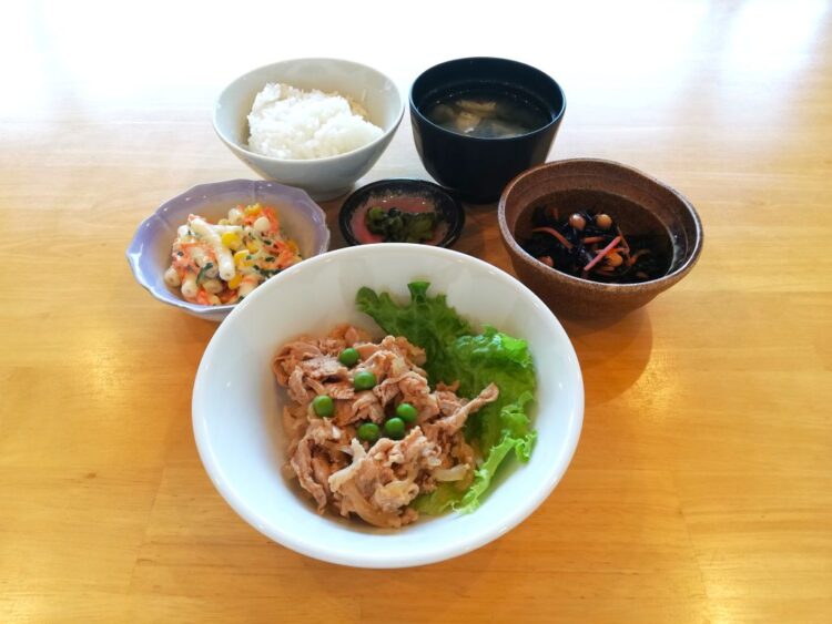ごはん、青梗菜のみそ汁、ポークケチャップ、大豆の柔らか煮、マカロニサラダ、青かっぱ漬け