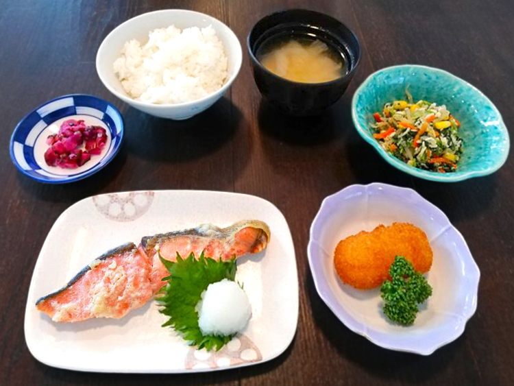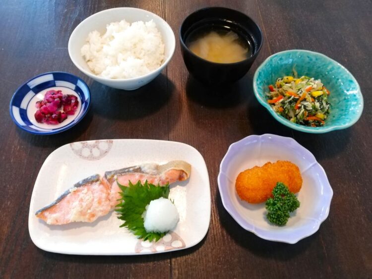 ごはん、白菜のみそ汁、鮭の塩糀焼き、かにクリームコロッケ、もやしの和え物、しば漬け