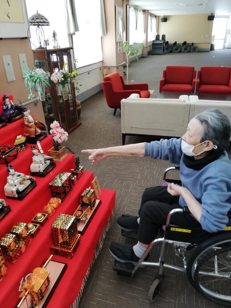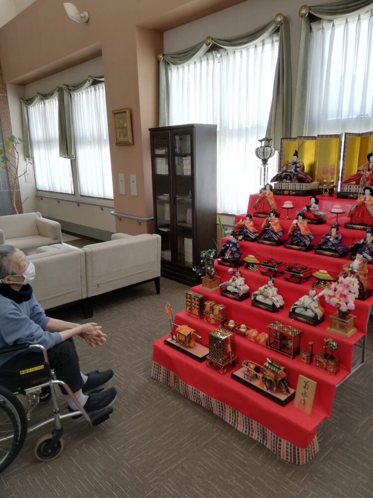 明日の3月3日はひな祭りです。1階のフロントでは立派な雛人形を飾られているため、お客様と一足先にお散歩をしながら見に行きました。