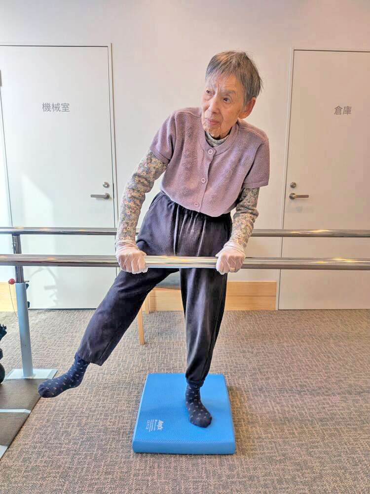 バランスマットは足元が少し不安定になるため、体のバランスを保とうとする力が自然と働きます。そのため、転倒予防・下肢筋力の向上・バランス感覚の維持などに効果があります✨
