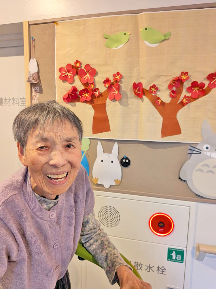 リハビリの後は職員が制作した「梅と鶯」の紙絵の前で、春を感じながらにっこり🌸🐦