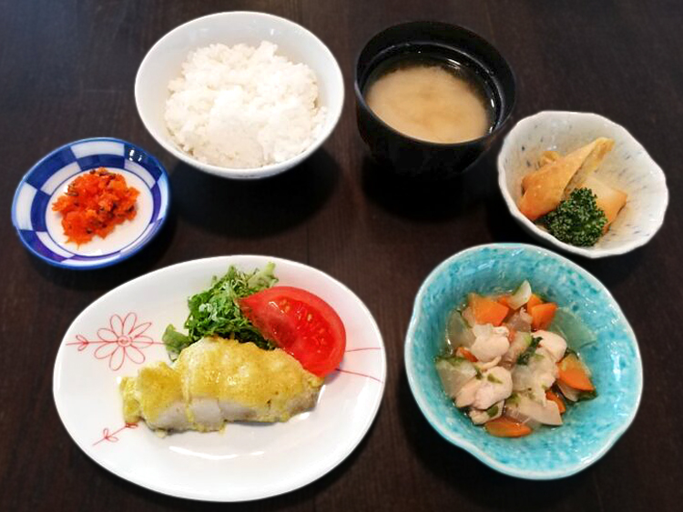 ごはん、大豆もやしのみそ汁、白身魚のカレー風味焼き、かぶの煮物、春巻き、赤しその実漬け