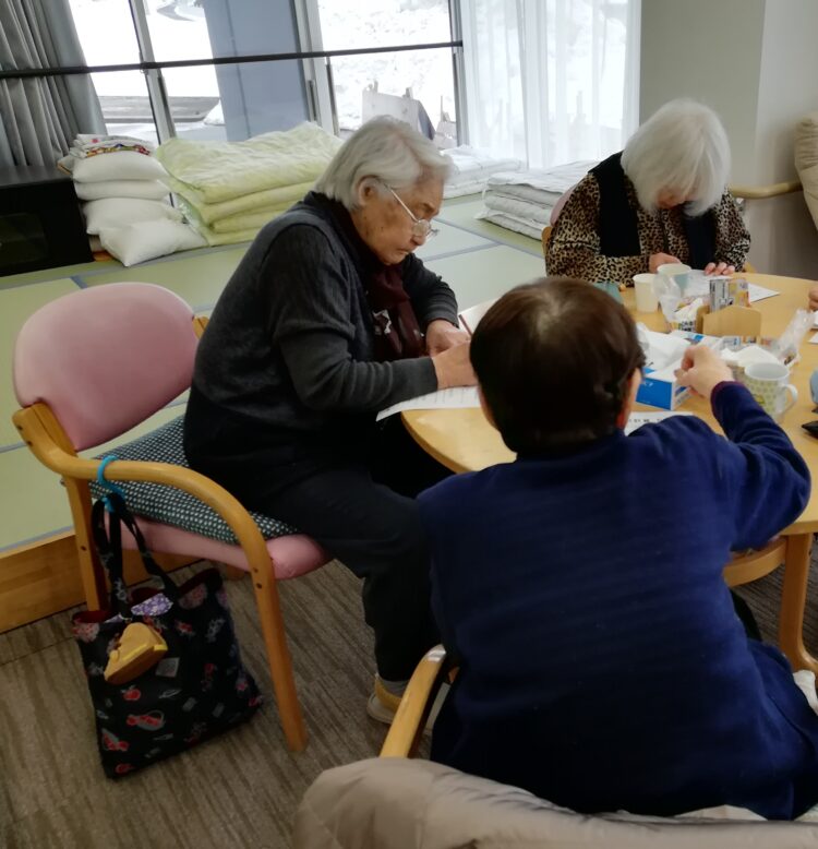 ブログをご覧の皆様こんにちは。今日のデイサービス午後からは昨日に引き続き・・・みんな大好き脳トレ???の時間となっておりました。利用者様にプリント問題、塗り絵組に分かれて頂き取り組んでもらいました。やはり脳トレと言うと表情がぱっとしない利用者様でしたがいざ、プリント問題・塗り絵を配るとやる気モード全開、とても熱心に取り組んでいました。