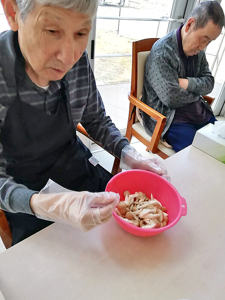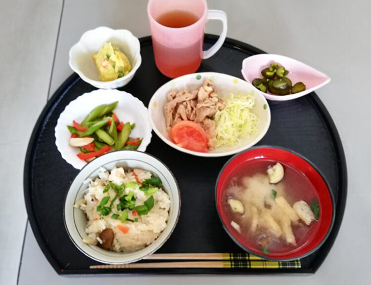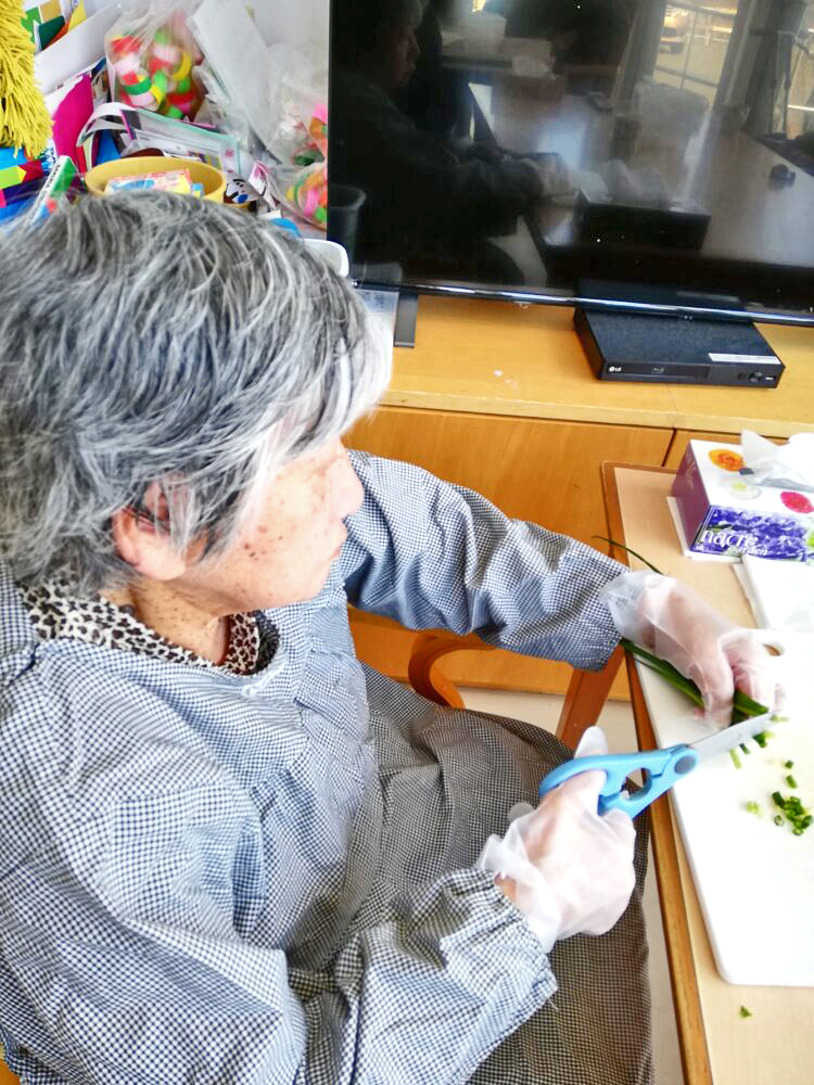 今日はお客様と調理活動を行ないました。メニューは炊き込みご飯です。お客様には肉や野菜をカットしていただきました。