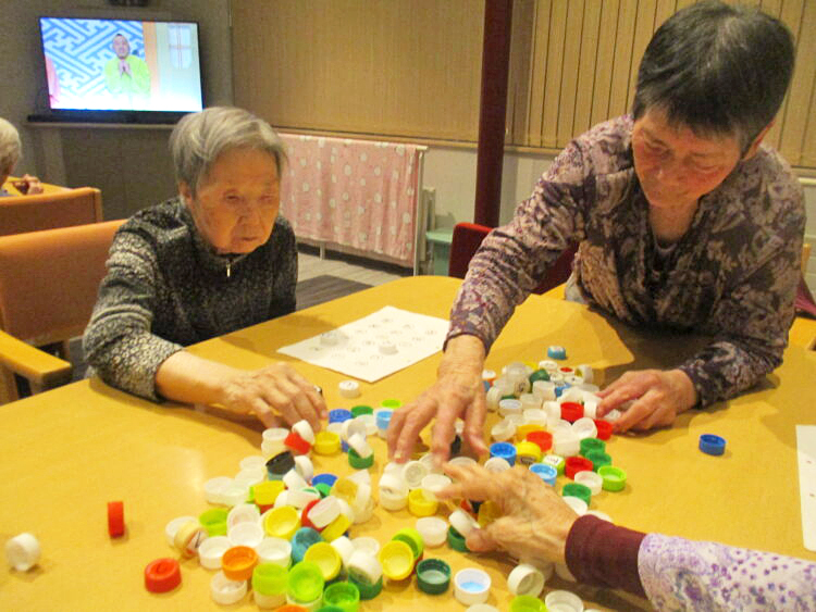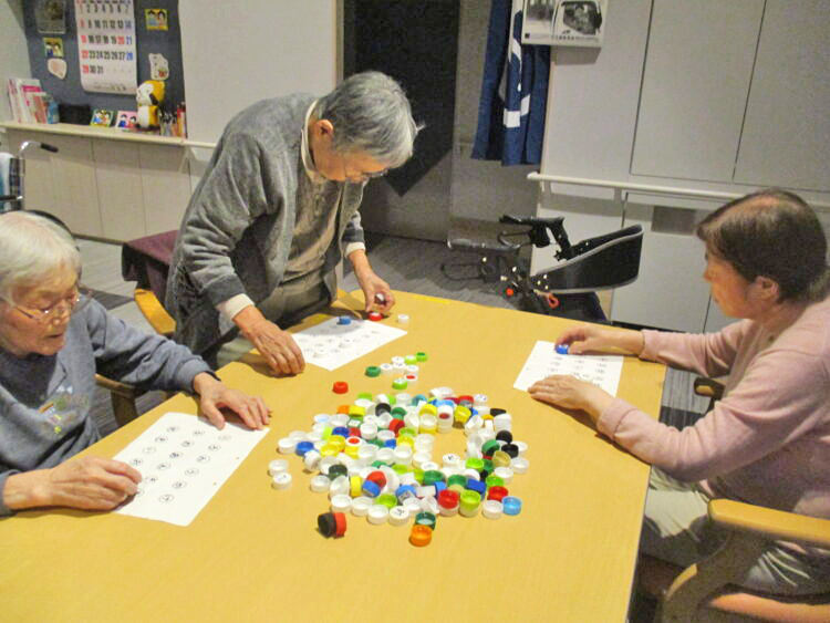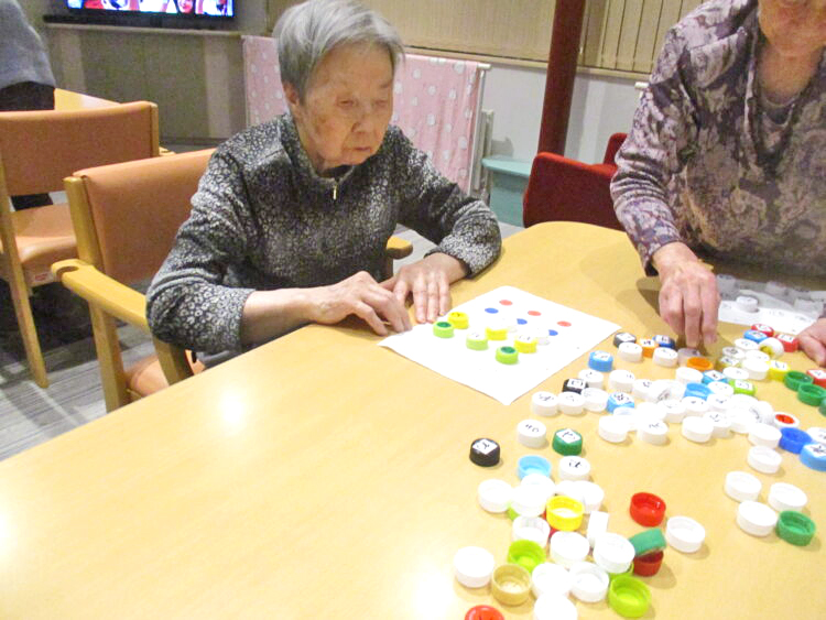 ペットボトルのキャップに書いてある平仮名と紙に書いてある平仮名を同じところに並べたりするゲームを行いました。