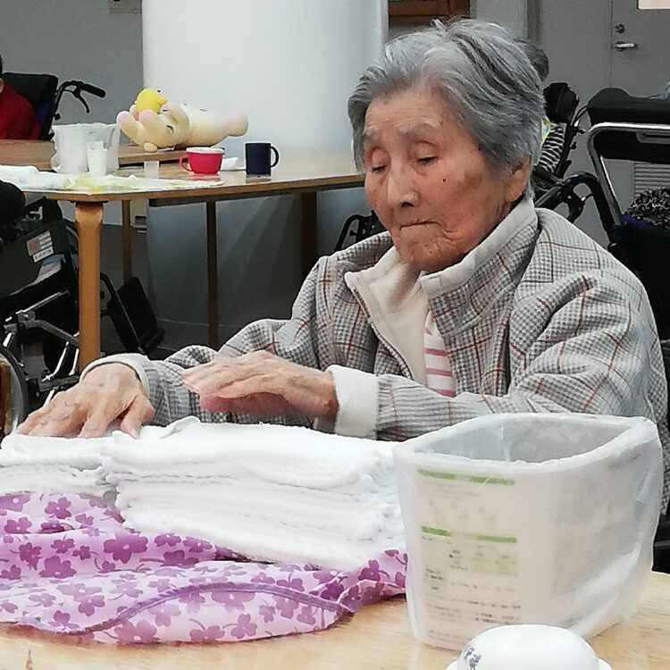 今朝はお客様用の洗顔タオルを畳んでくださるA様の様子をお見せしたいと思います。朝は起床したお客様の顔を洗うために洗顔タオルを使用し洗濯し、乾燥機で乾かした物を畳むのですが、A様が「私に畳ませてください」とやる気の様子。お願いしたところ、とても綺麗に畳んでくださいました!