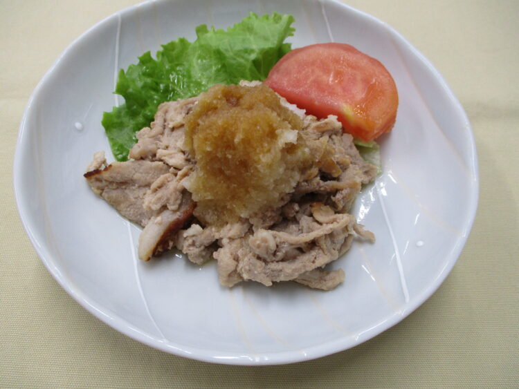 ご飯、もやしときくらげのスープ、豚肉のおろしポン酢がけ、チンゲン菜とあさりのソテー、エビカツ、スパゲティサラダ、のり佃煮