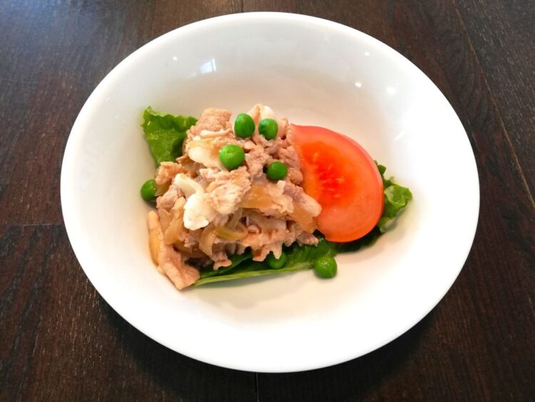 ごはん、きのこスープ、ポークオニオンソテー、ひじきの旨煮、マセドアンサラダ、たくあん漬け