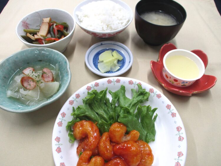 ご飯、大根と油揚げのみそ汁、えびチリ、いんげんとさつま揚げの炒め物、かぶのポトフ風煮、