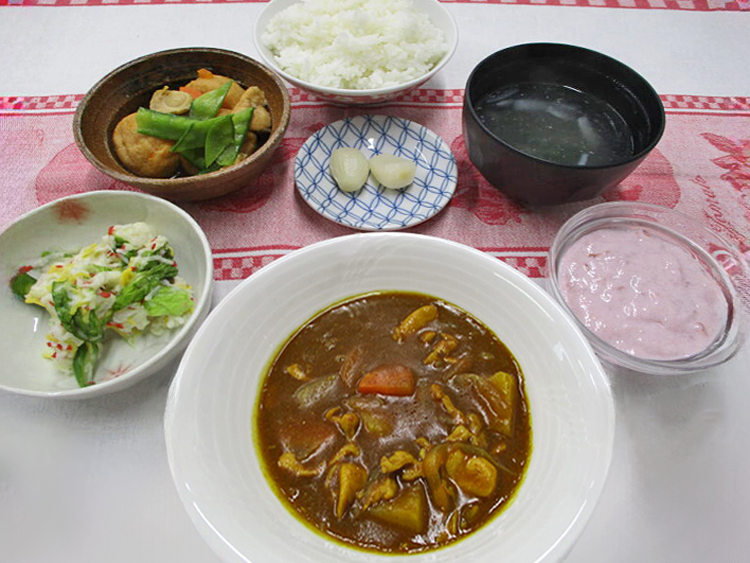 ご飯、わかめスープ、チキンカレー、アスパラとカニカマのサラダ、帆立とがんもの煮物、らっきょう漬、いちごフルーチェ