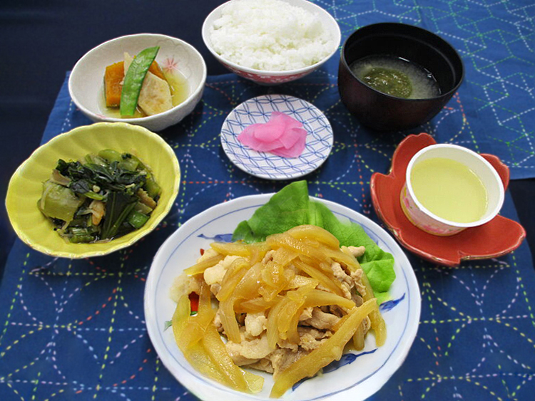 ご飯、豆腐ととろろ昆布のみそ汁、ポークソテーオニオンソース、チンゲン菜とえびの炒め物、南瓜と笹かまの炊き合せ、桜大根漬、りんごゼリー