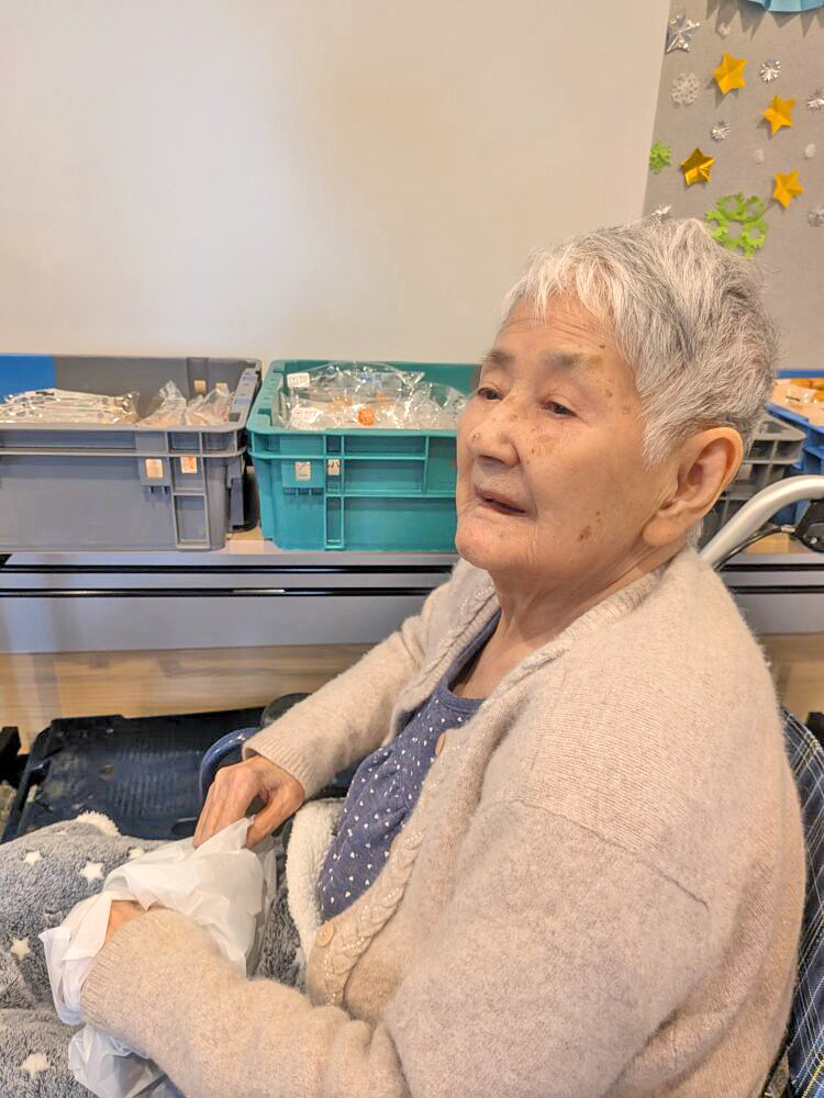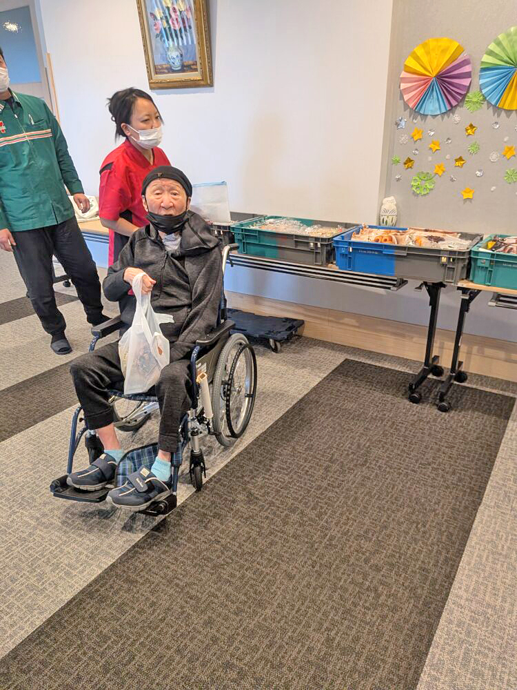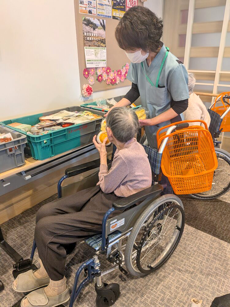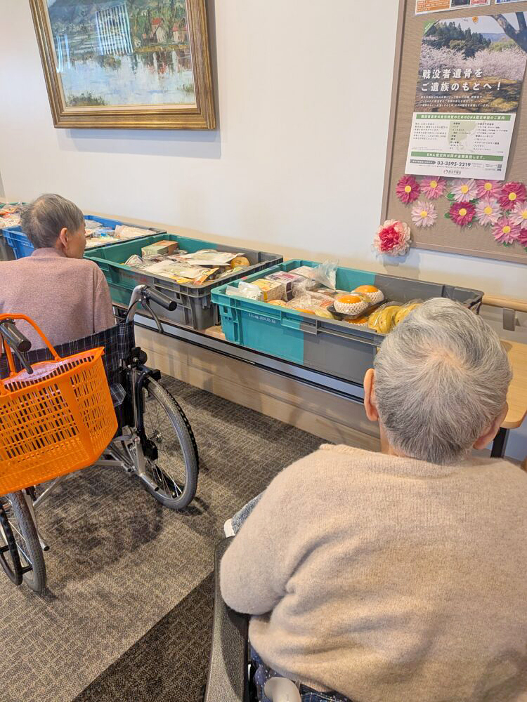 お菓子や果物などが並び、利用者様は「何にするがな~」と笑顔でお買い物🛍️