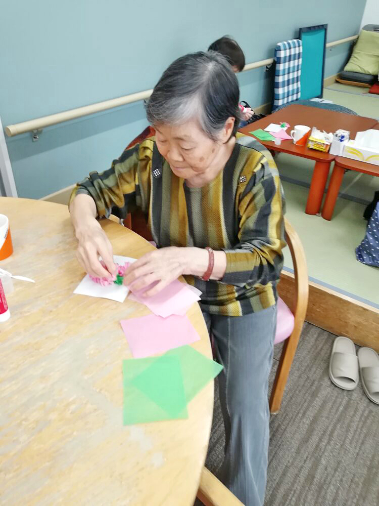 本日も工作レクで、デイサービスに飾る、桜の壁画をお客様と作りました!