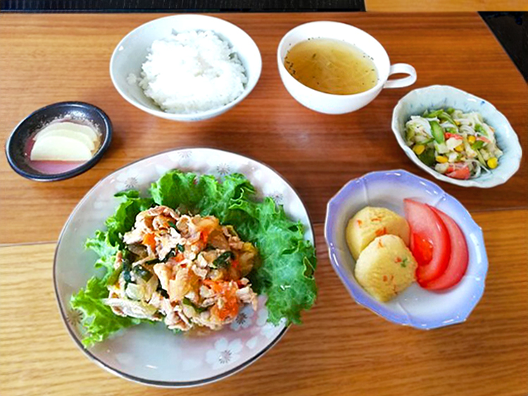 ごはん、コンソメスープ、プルコギ、玉子と豆腐のしんじょ、アスパラサラダ、べったら漬け