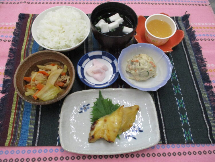 ご飯、はんぺんと万能ねぎの清汁、めばるの西京焼き、白菜とエリンギの甘酢炒め、蒸し鶏根菜ごまサラダ、長芋漬、ピーチゼリー