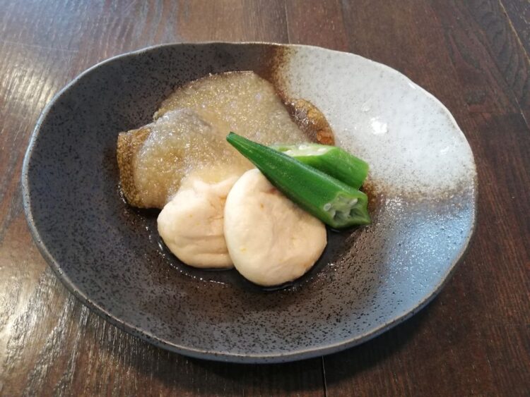 ごはん、わらびのみそ汁、かれいのおろし煮、ごぼうの味噌炒め、ほうれん草の和え物、福神漬け