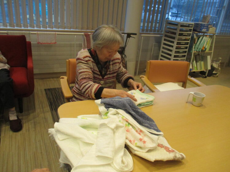 夕食後に家事活動を行いました。食器拭きやタオル畳作業をお願いしました。