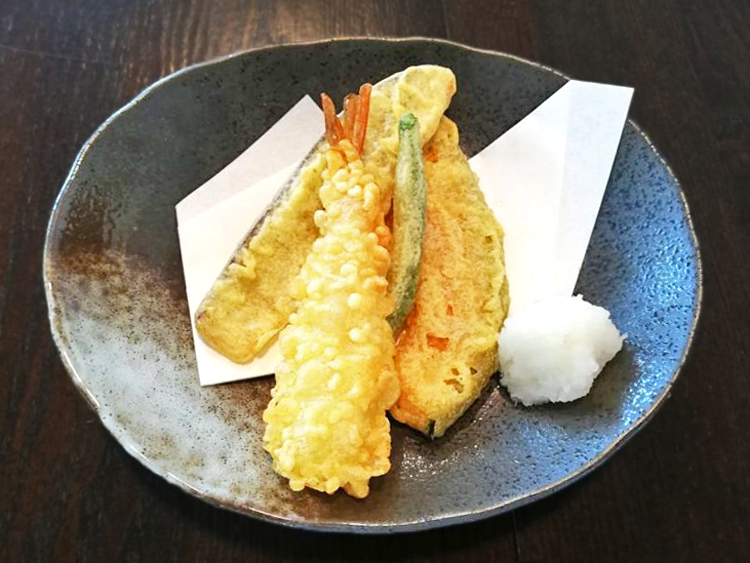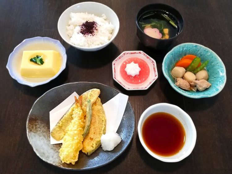 ゆかりご飯、豆腐と三つ葉のすまし汁、天ぷら、里芋の炊き合わせ、たまご豆腐、お祝いゼリー
