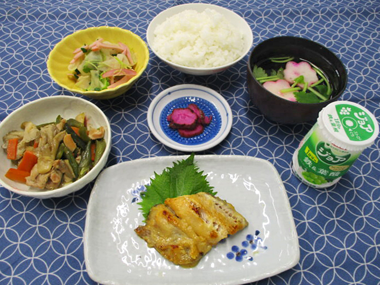 ご飯、花麩と三つ葉の清汁、ほっけの西京焼き、いんげんと鶏肉のソテー、かぶとハムのサラダ、しば漬、ジョア