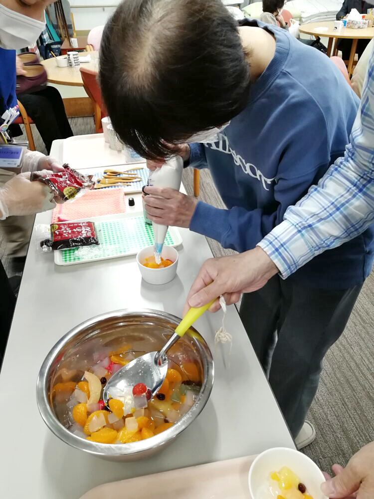 おやつ喫茶はあんみつを提供させていただきました♡出来る方には自分でフルーツをお皿にいれたりクリームを絞っていただいたりお手伝いしていただきましたよ