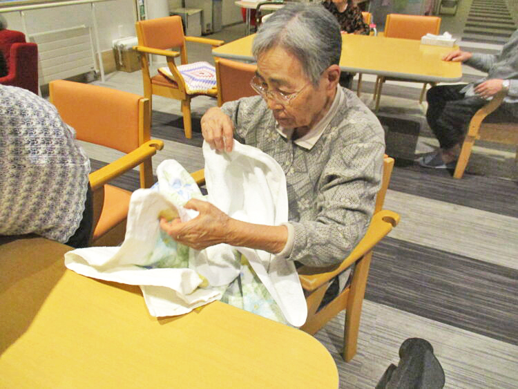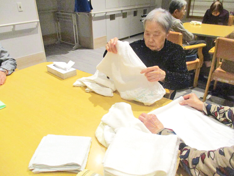 お客様皆さんが真剣な表情でタオルや洗濯物畳みを行いました。畳み終わり「ありがとうございました。」と伝えると、笑顔が見られていました。