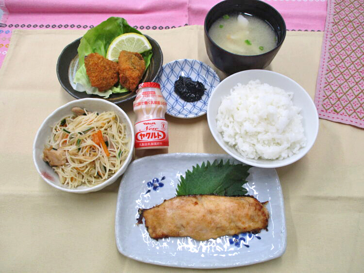 ご飯、竹輪と万能ねぎのみそ汁、鮭の和風ムニエル、ビーフンソテー、ピーマンの肉詰めフライ、のり佃煮、ヤクルト