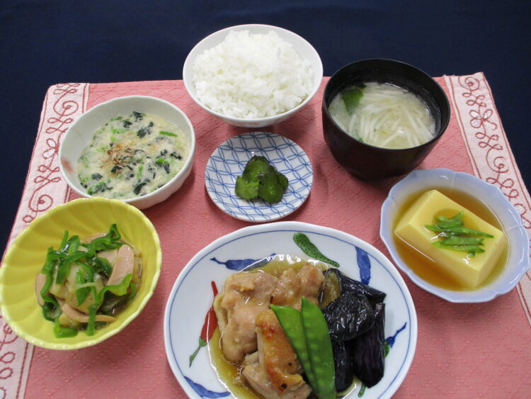 ご飯、もやしとわかめのみそ汁、鶏肉となすのうま煮、カリフラワーとソーセージのソテー、ほうれん草のとろろ和え、卵豆腐のあんかけ、青かっぱ漬