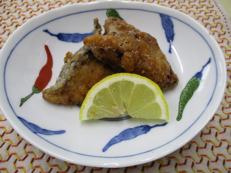 ご飯、じゃが芋と玉葱のみそ汁、あじの竜田揚げ、すき昆布と豚肉の炒め物、ブロッコリーのかにあんかけ、身欠きにしん酢味噌和え、長芋漬