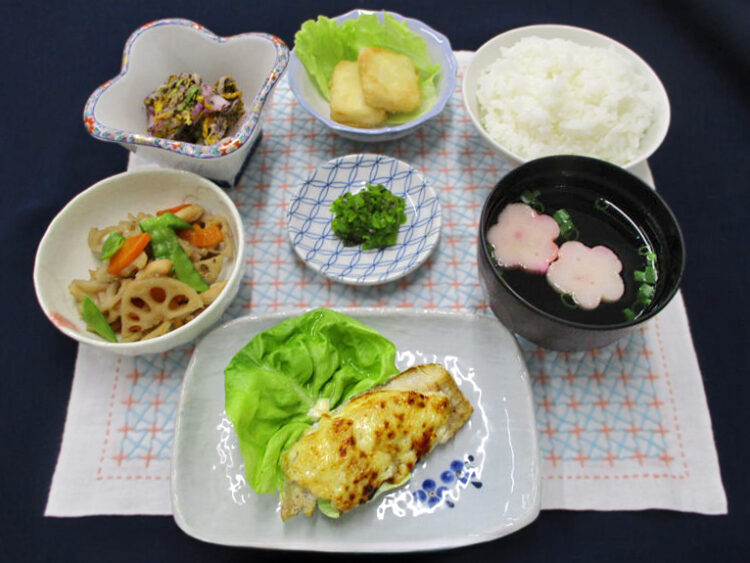 ご飯、花麩と万能ねぎの清汁、たらの味噌マヨネーズ焼き、れんこんと鶏肉の炒り煮、白菜のゆかり和え、豆腐ナゲット、青じその実漬