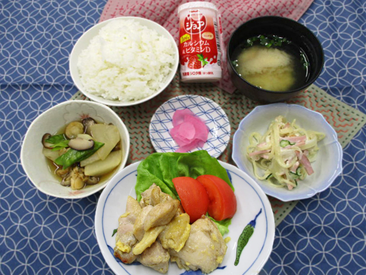 ご飯、なるとと万能ねぎのみそ汁、チキンピカタ、かぶと帆立の煮物、スパゲティサラダ、桜大根漬、ジョア
