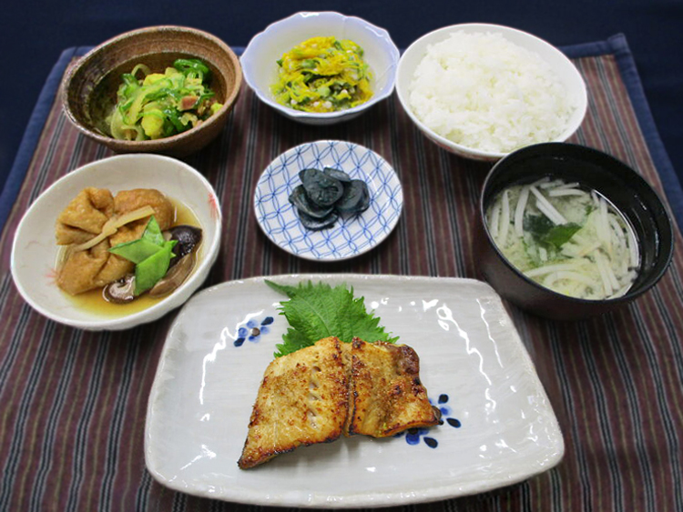 ご飯、もやしとわかめのみそ汁、ほっけの南部焼き、カリフラワーのカレー炒め、五目巾着の含め煮、オクラと菊のおろし和え、なす漬