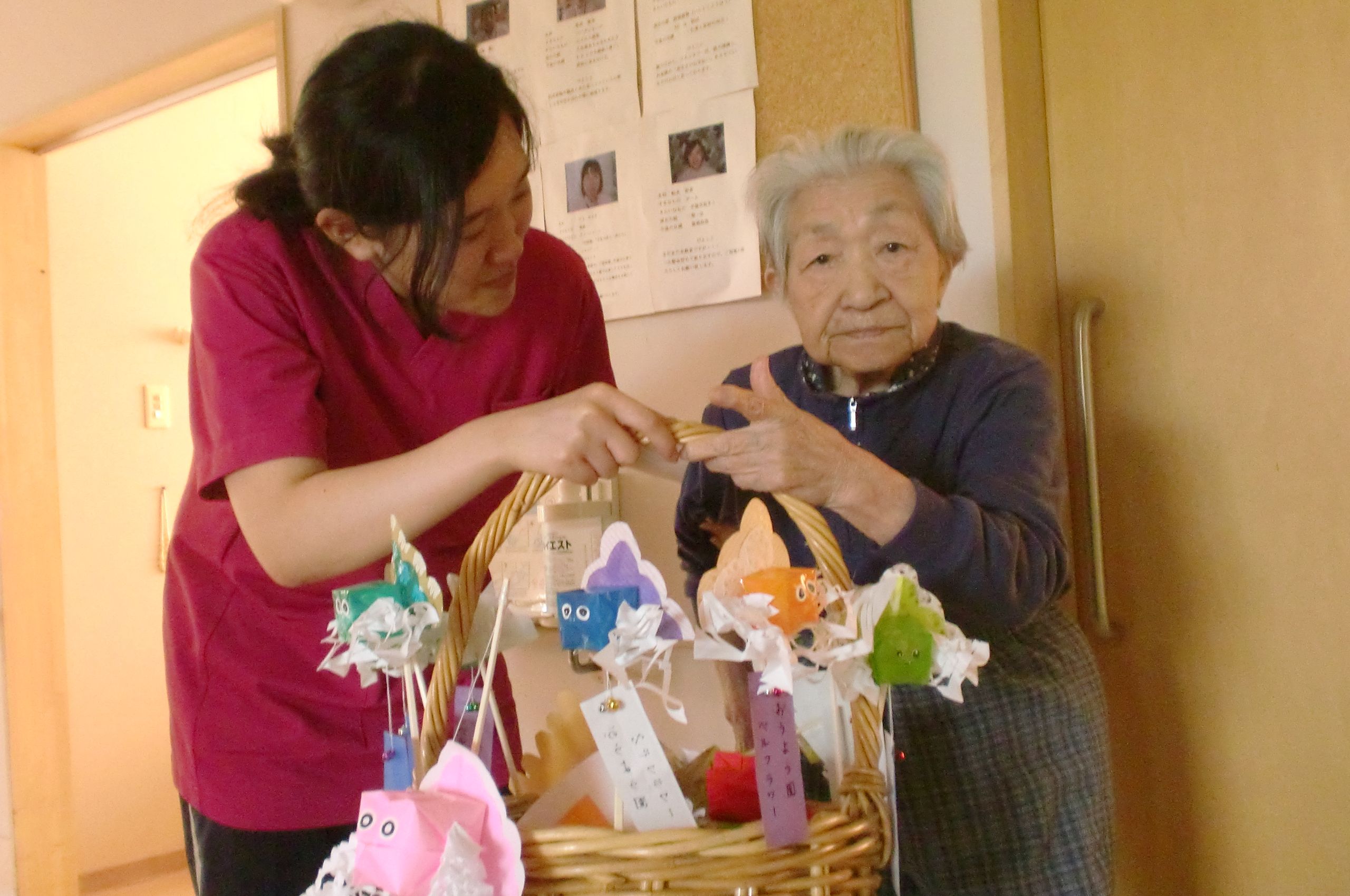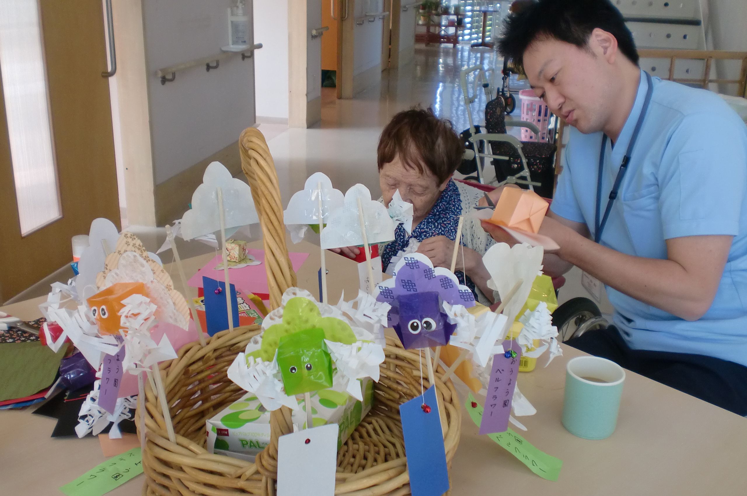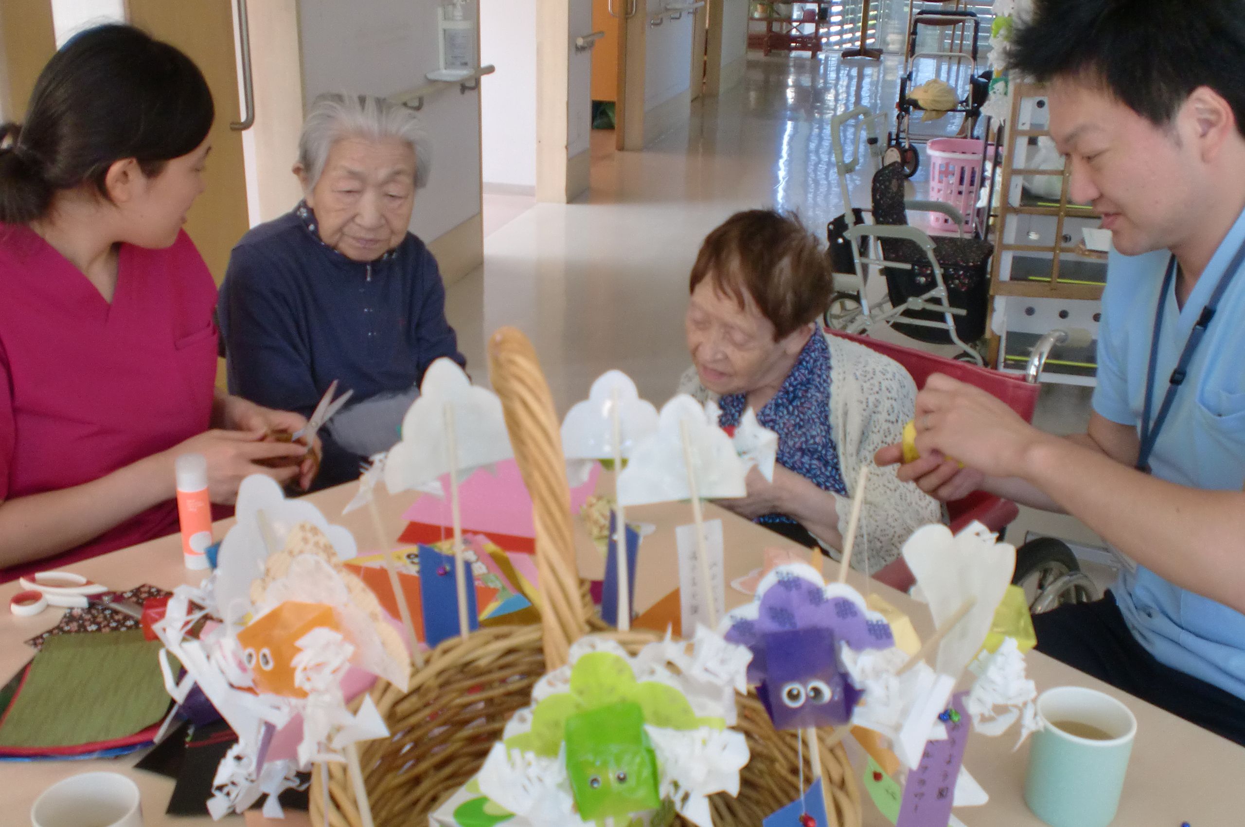 さて写真は金魚ねぷた作りにいそしむお客様と職員。
