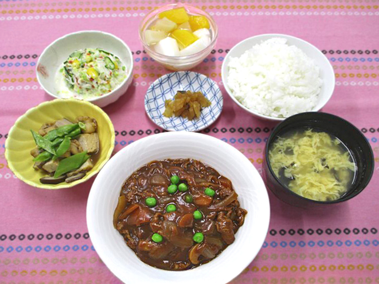 ご飯、たまごときくらげのスープ、薄切り牛肉のハヤシライス、コーンサラダ、