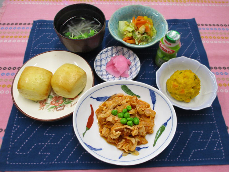 ミルクパン、大根とかいわれのスープ、ポークケチャップソテー、春キャベツとあさりの蒸し煮、南瓜のツナサラダ、桜大根漬、ヤクルト