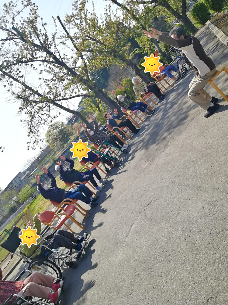 陽を浴びながら、肩や足腰を伸ばしたり、足踏みをして運動したり気持ちよさそうに取り組んでいました。最後は深呼吸して、外の空気を感じて終了しました。