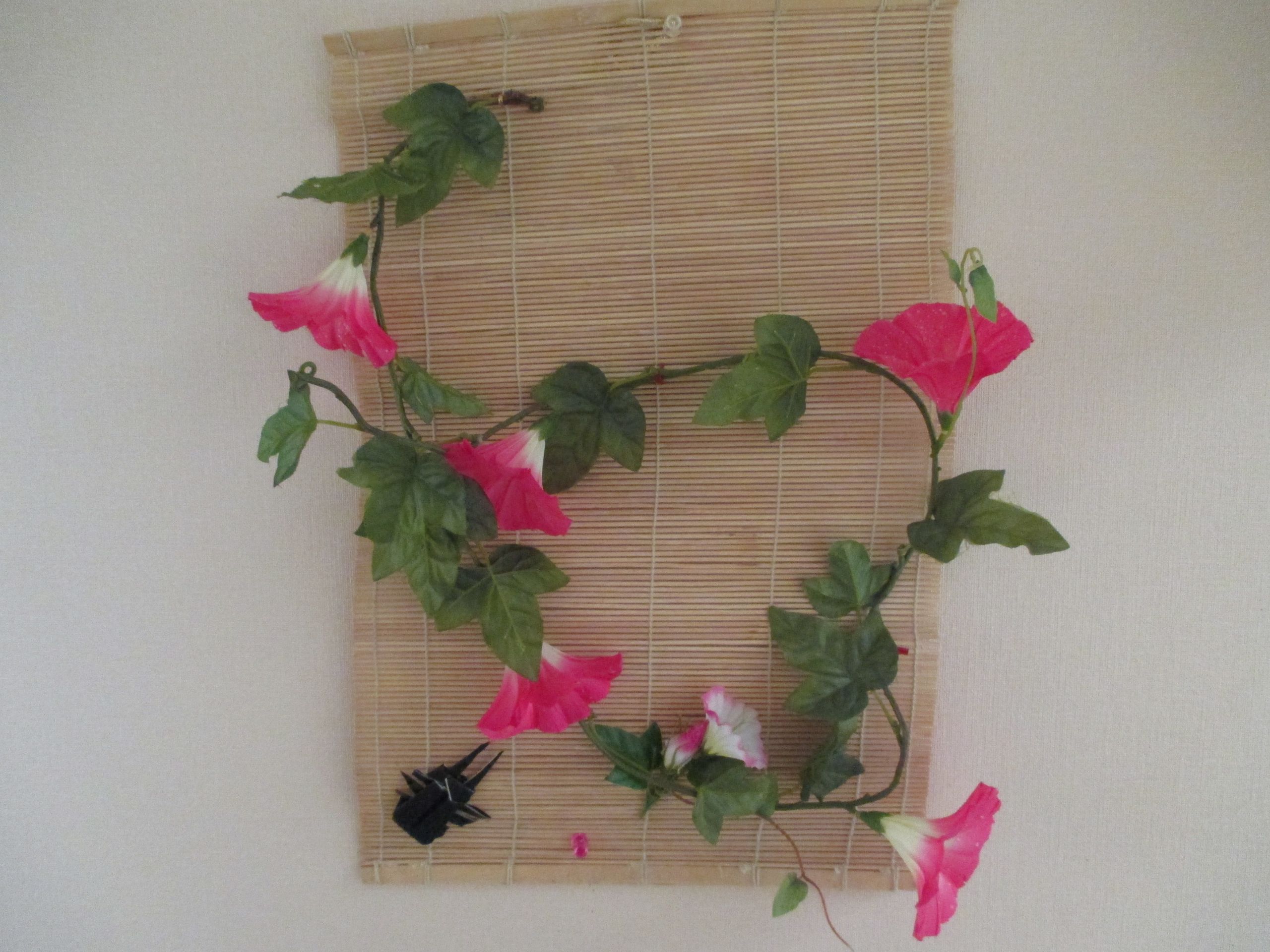 まずはこちら。赤いアサガオがとても綺麗ですね。左下には折り紙で作ったクワガタがおり、「夏」という感じが伝わってきます。