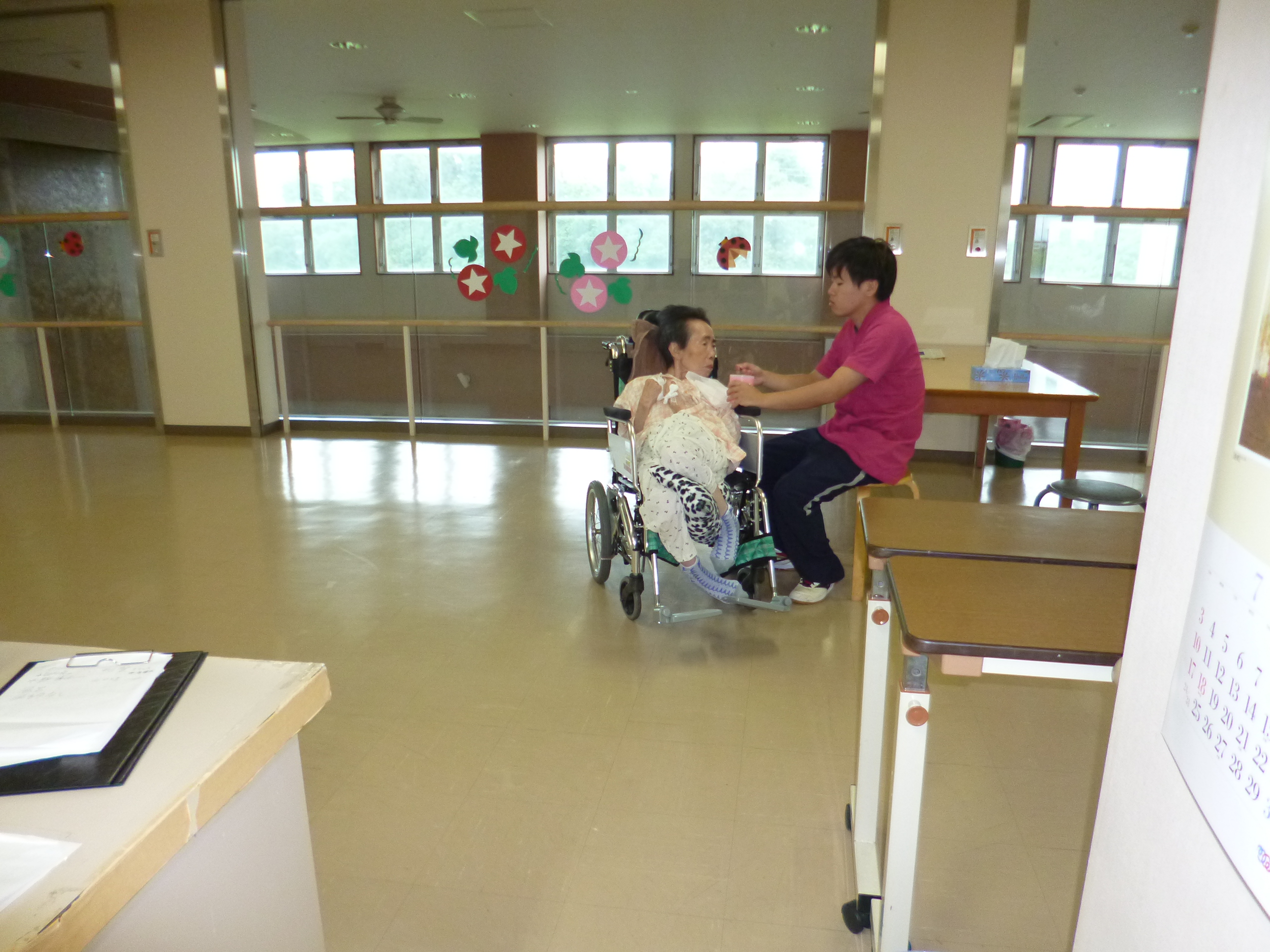 さて、今日は午後のお茶会時にとてもおいしそうにジュース飲んでいらっしゃるT様を撮影しました。まだまだ暑いこの夏に冷たいジュースが身に染みる・・・皆様はどうですか?私は冷たい方がサッパリしてほてった身体を冷ますことができるのでキンキンに冷えた飲み物を好んで飲みます。T様にはあまりに冷たかったのか顔を少ししかめて召し上がっていらっしゃいました。(遠くてわかりづらいですが・・・。)新人のY職員も毎日一生懸命お客様のケアに努めています。新人職員も一人で業務をこなせるようになってきて先輩職員と共に頑張ろうと意欲が伝わってきます。私も新人職員と共に日々勉強しみんなでケアに努めていきたいです。(ショートA・T)