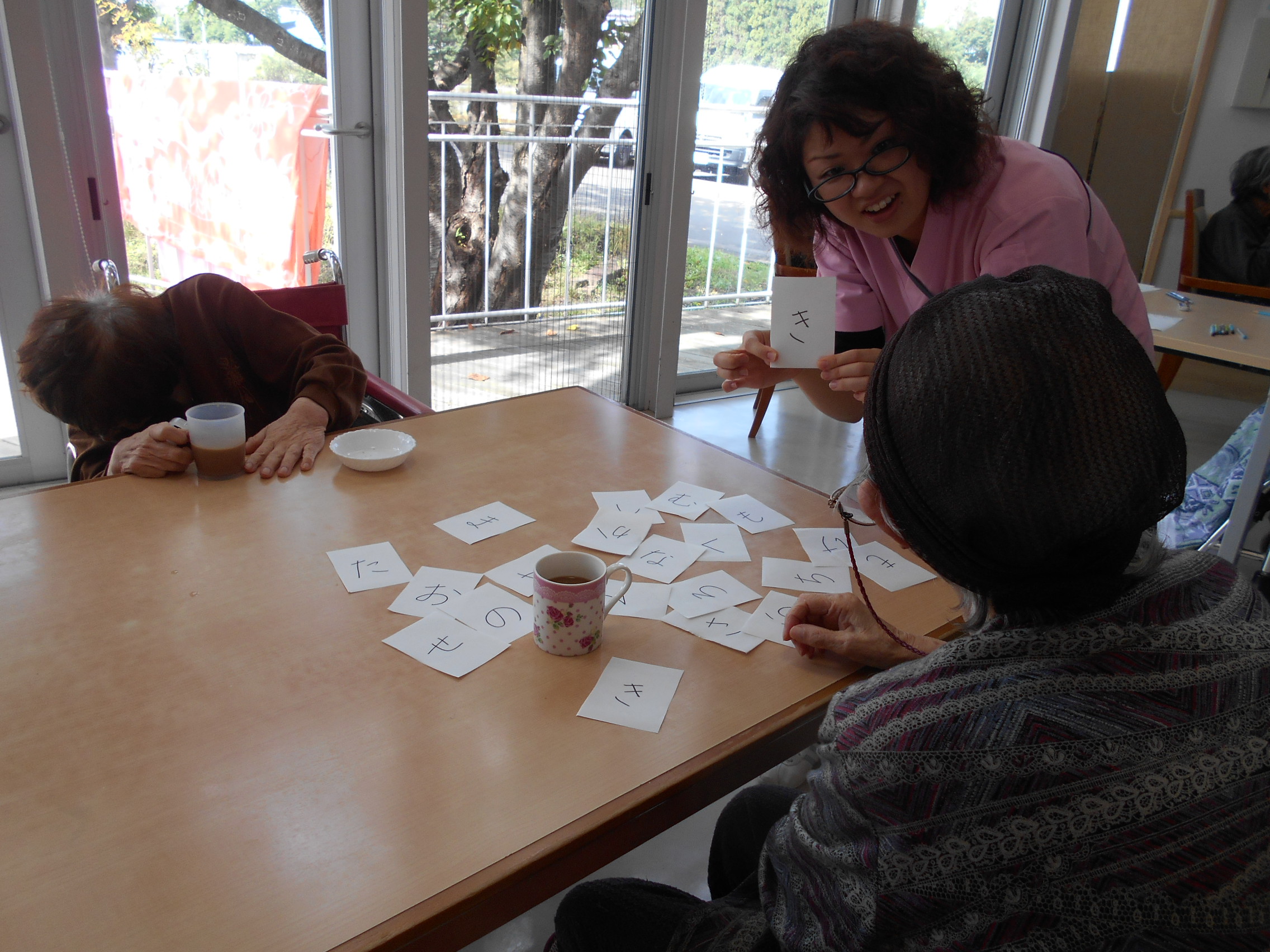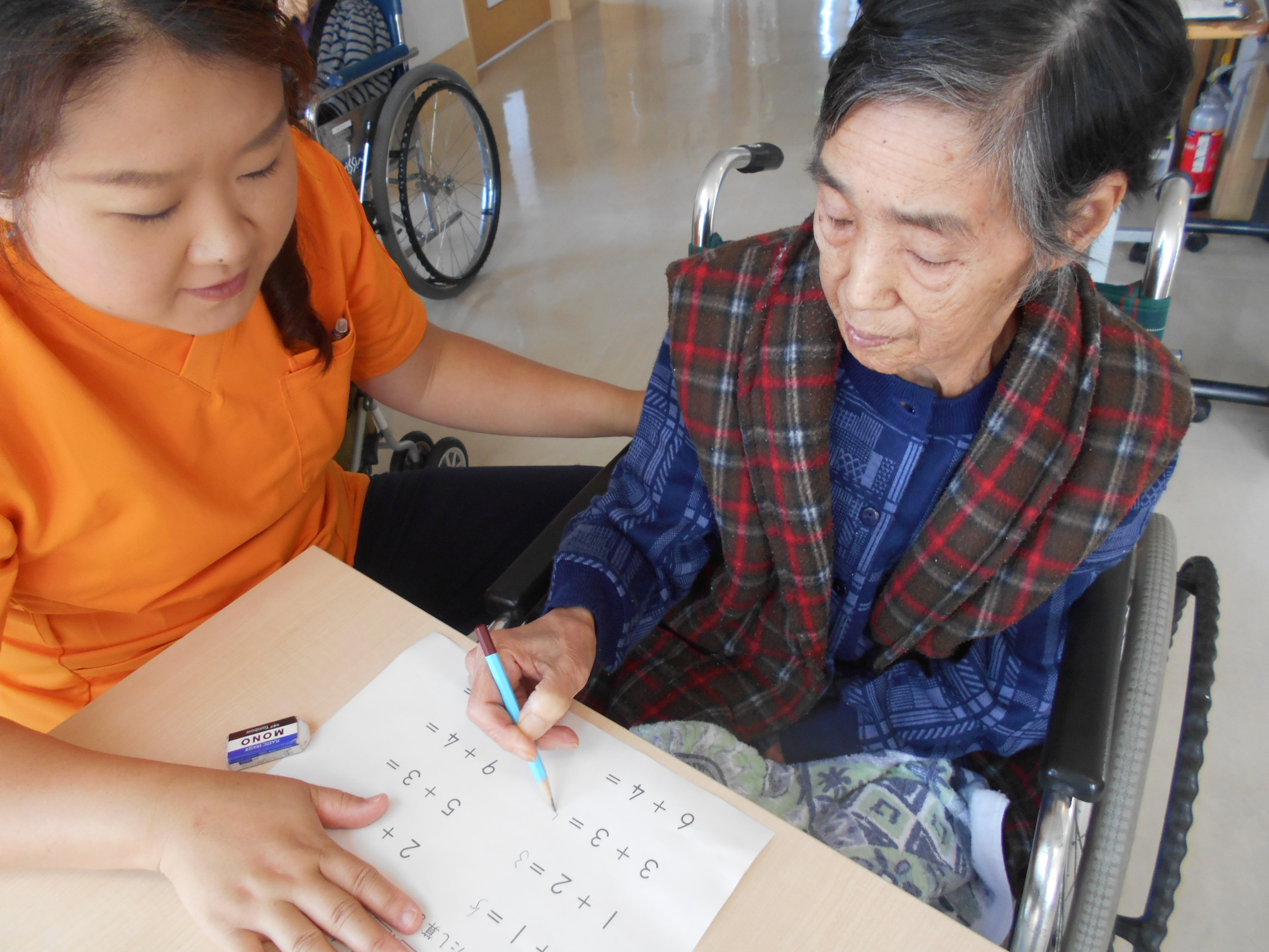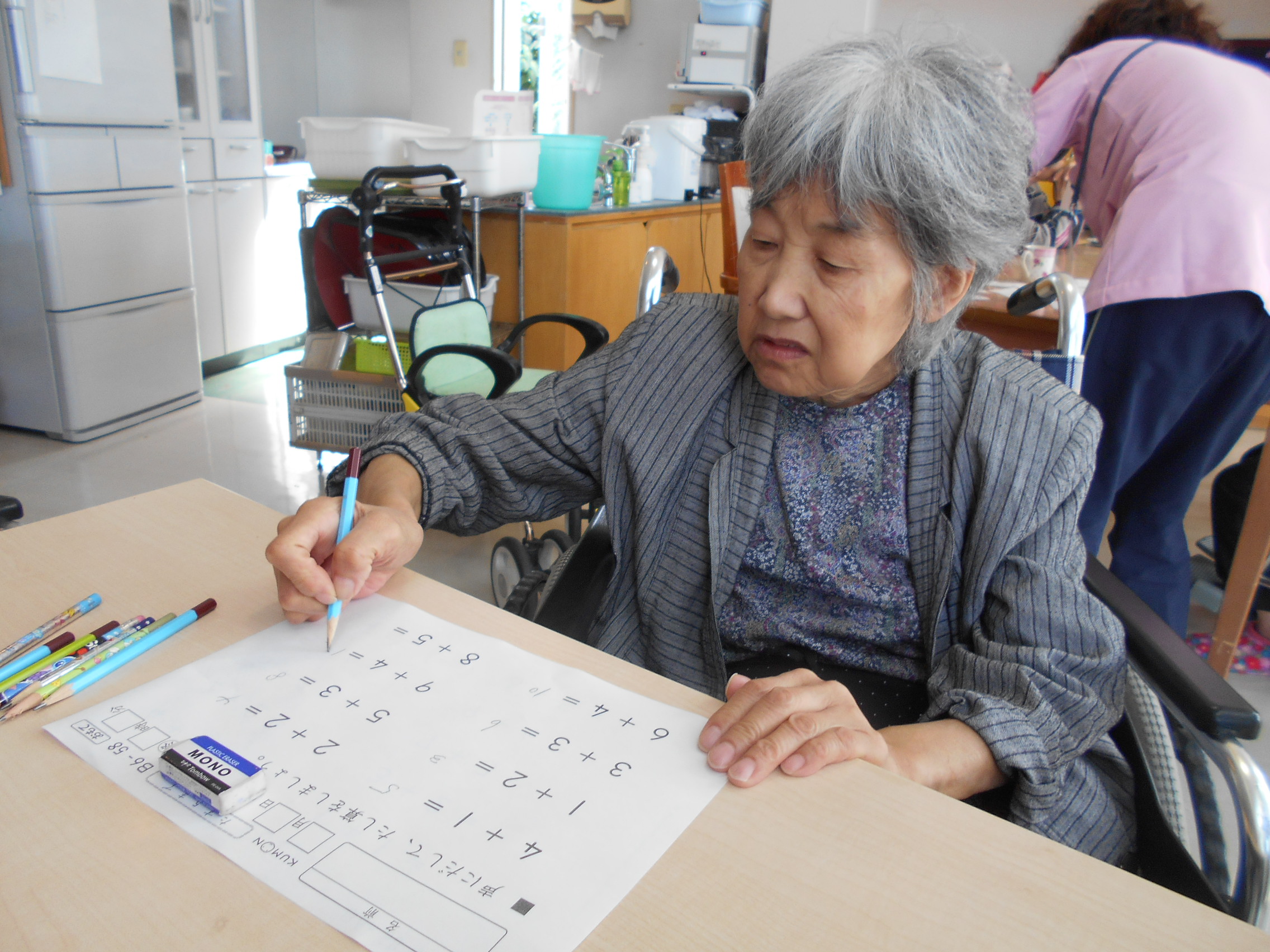 公文学習の時間は、お客様とスタッフが1対1で会話を交わせる交流の時間ともなっており、「あれや、これや」とたわいもない会話を交わしながら・・・