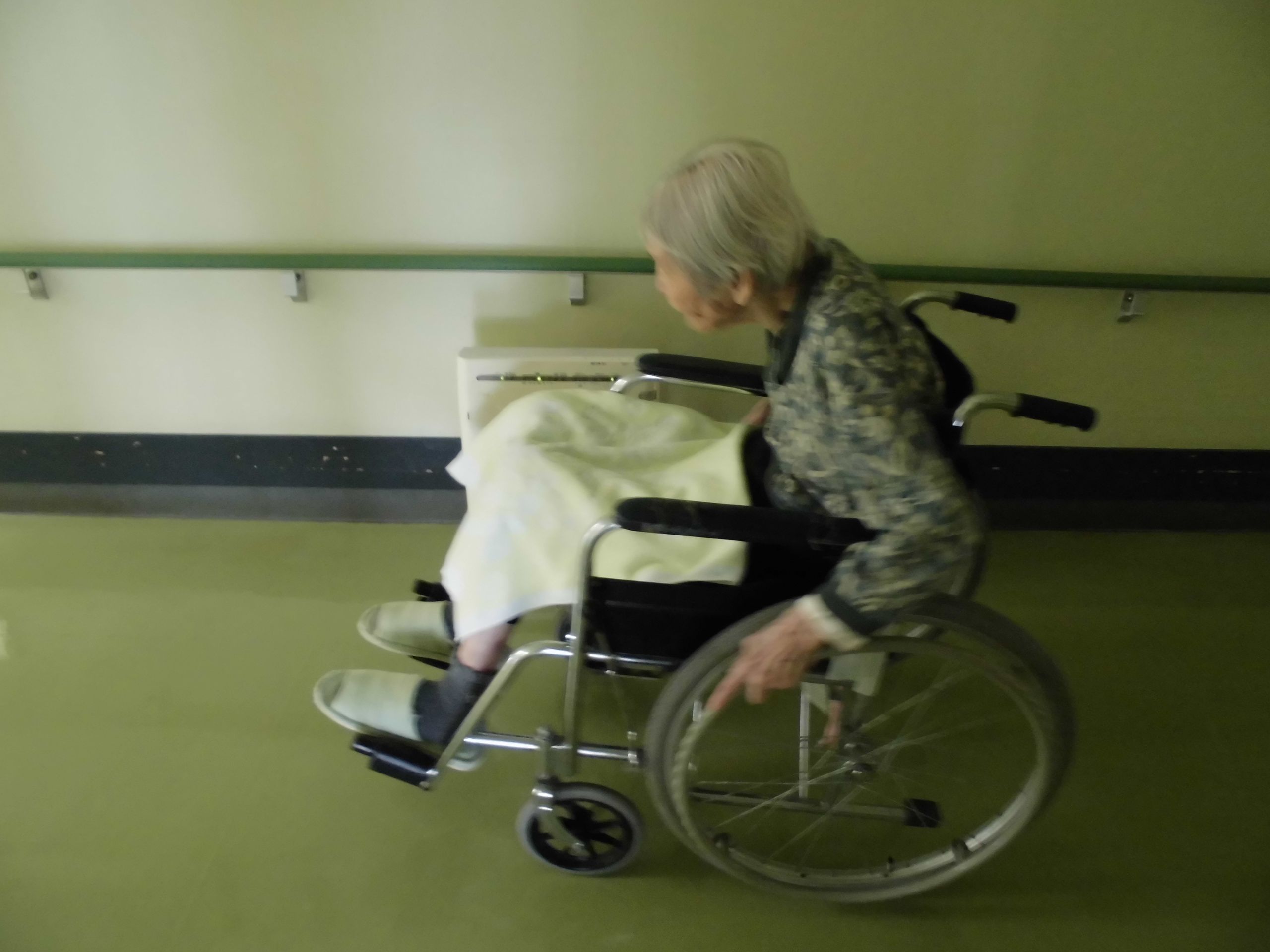 本日は車椅子での自走訓練です。短距離であれば自走できますが疲れがあるためか休み休みホールまで車椅子で来る姿を良く見ます。