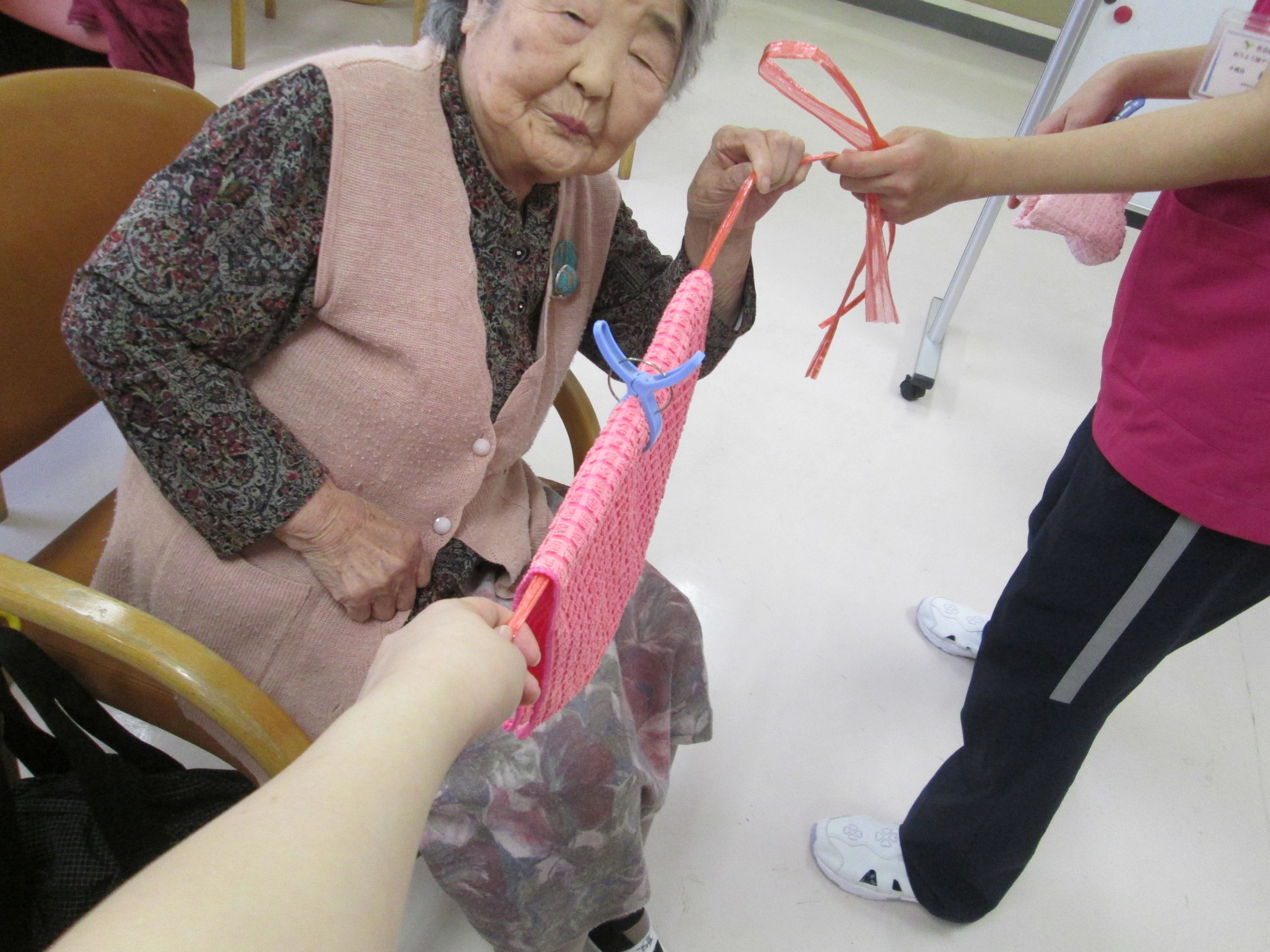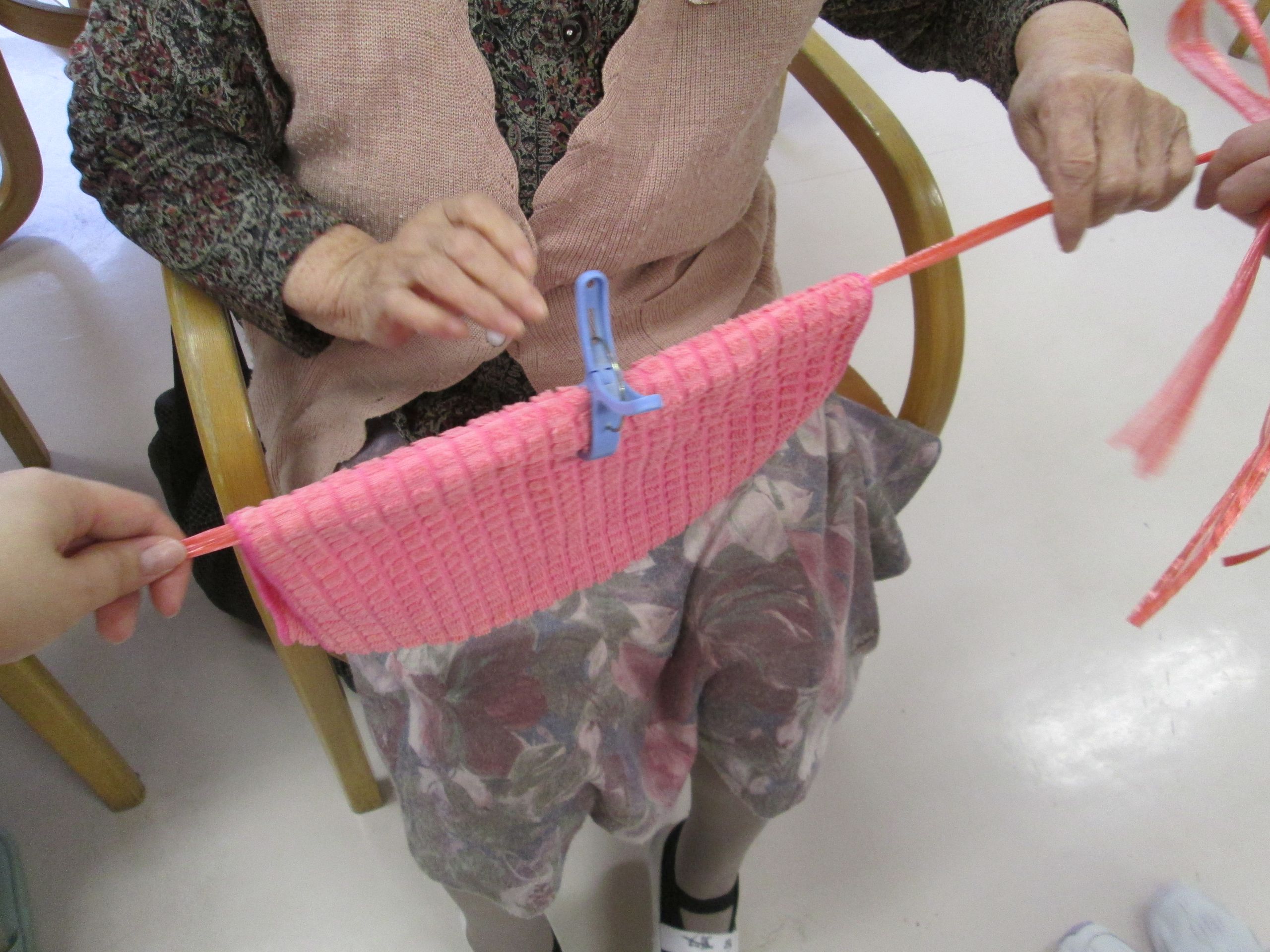 次に送ったものは・・・紙コップに紐を通し、紐を外し隣へバトンタッチ