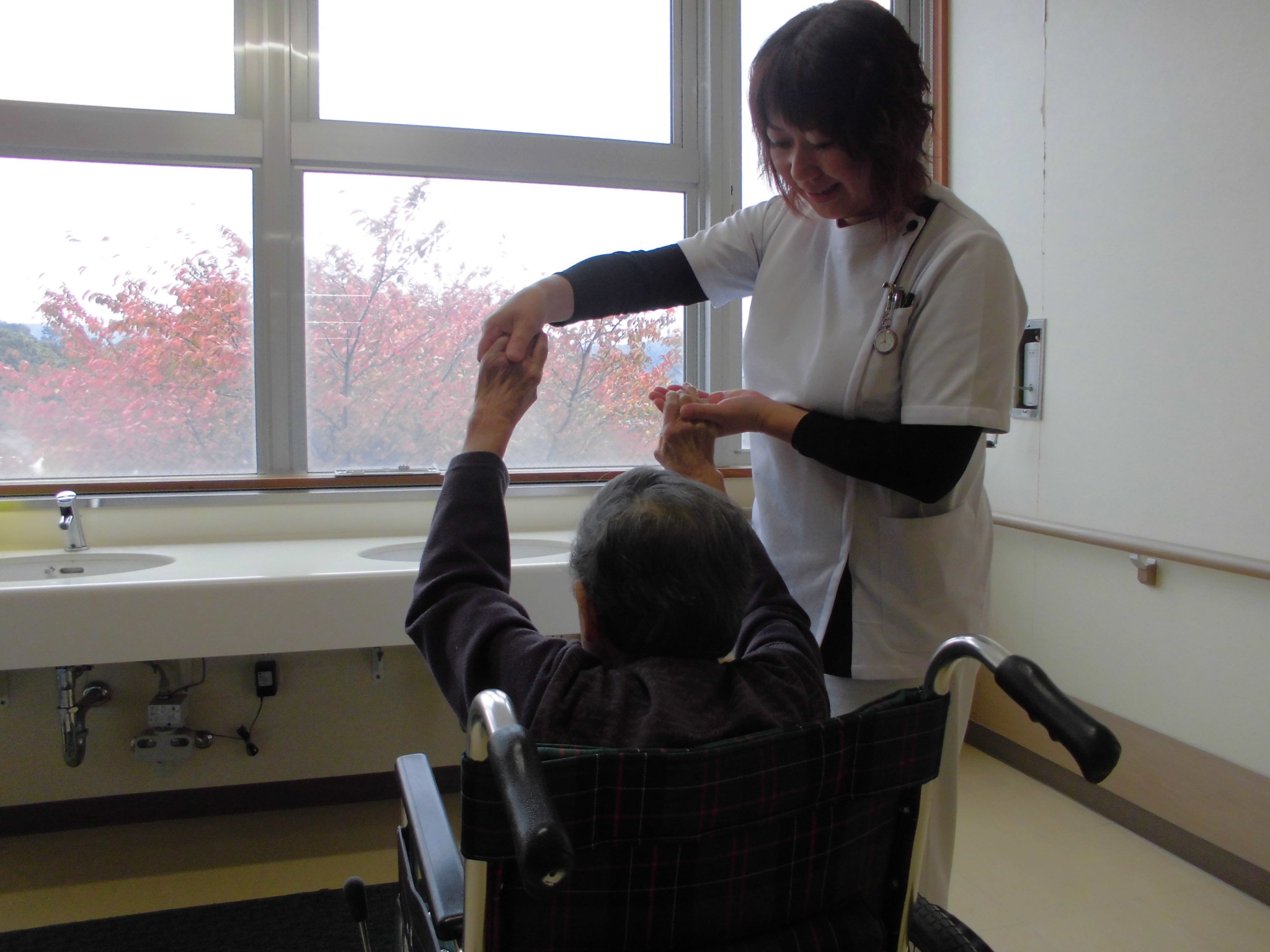 みなさんこんにちは!今日は新館ショートステイのお客様、K様をご紹介します。今日の訓練は、K様と紅葉をながめながら行いました。
