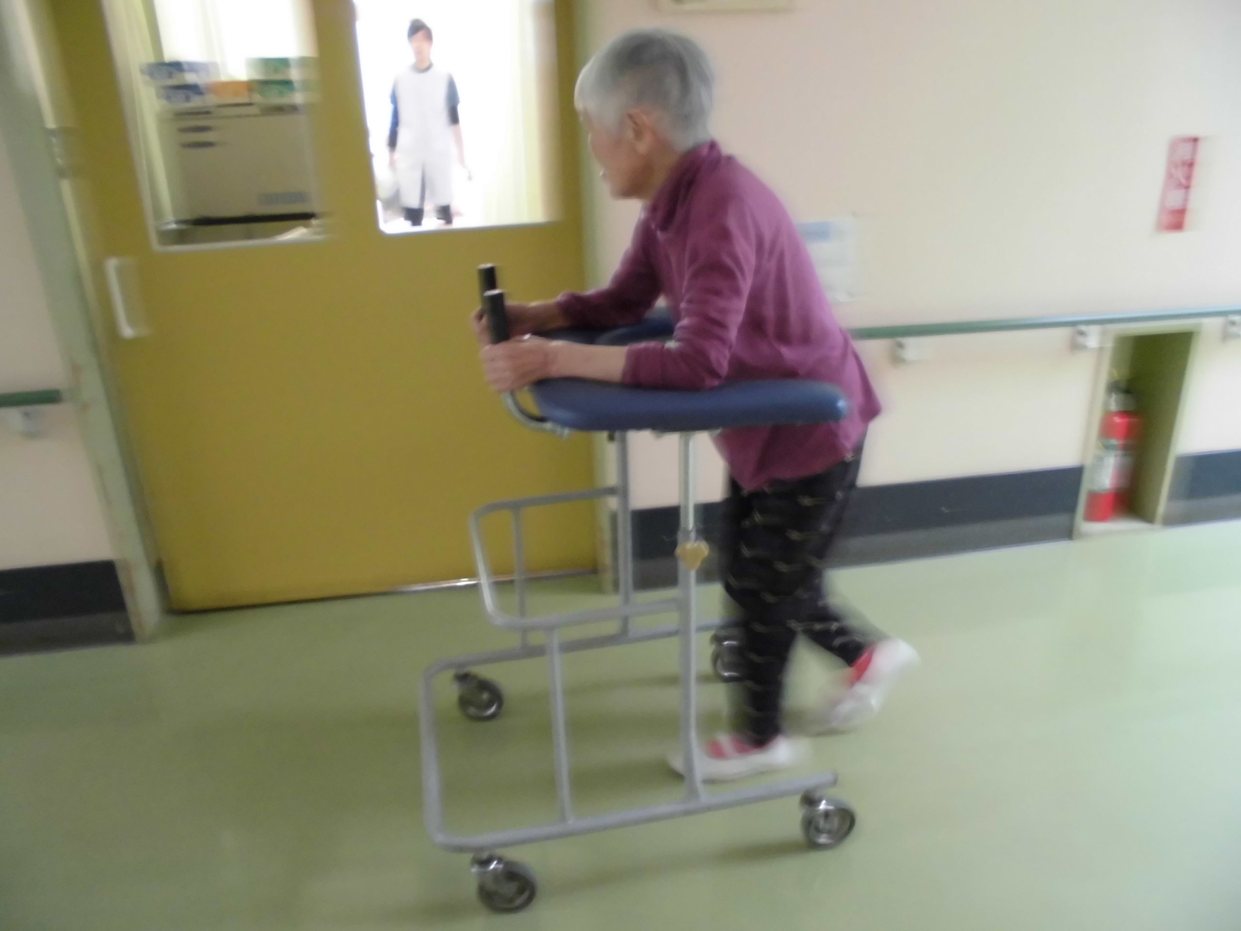 歩行器を使い歩行訓練をしているS様ですが…..そわそわしている様子ですが