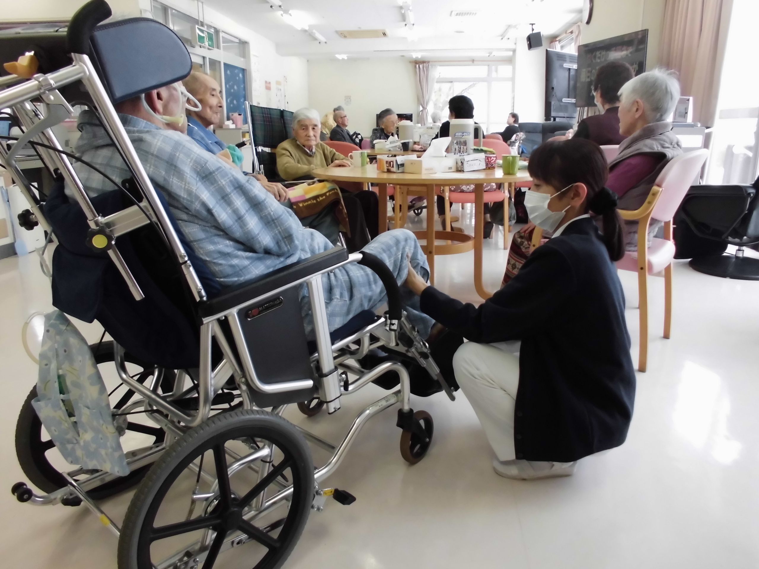 皆さんこんにちは。昨日の雪はすごかったですね。今日は雪景色を見ながら、上下肢の屈伸運動をしているのはY様。....まんまるに目を見開いて頑張っていました。